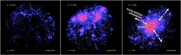 J.Diemand, J.Stadel and B.Moore tarafından yapılan simulasyondan alınan bu 3 görüntü’de kozmik yapıların zamanla gelişimi görülüyor. Görüntüler evrenin büyüklüğünün sırayla %20,%60 ve %100 olduğu durumlardan alındı. İlk başta kütle çekimi etkisiyle oluşan devasa yapıların (galaksi kümelerinin) zamanla genişleyen evrende karanlık enerji ile büyümelerinin nasıl kısıtlandığı açıkça görülebiliyor. (Not: Fotoğraflar karşılaştırma için gerekli şekilde ölçeklendirilmiştir.) (Kaynak : Chandra X-Ray Obs.)