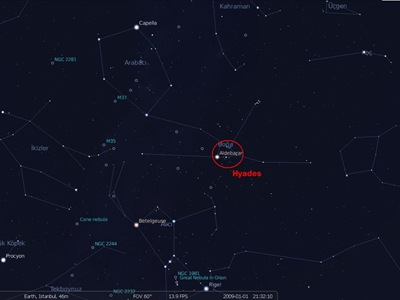 Gece gökyüzünde erken saatlerde güney doğu, ilerleyen saatlerde güneye doğru bakarsanız ünlü Avcı takımyıldızının biraz üstünde parlak bir yıldız olan Aldebaran ile kolayca bulabileceğiniz Boğa takımyıldızında yer alan bir açık yıldız kümesi. Çıplak gözle V şeklinde kolayca fark edilen bu küme yaklaşık 130 ışık yılı uzaklıkta olup Güneş’e en yakın ikinci açık yıldız kümesi olma özelliğini de taşır. Birbirlerine uzaklıkları ortalama 20 ışık yılı olan 200’ün üzerinde yıldızdan oluşan Hyades, gökyüzünde 6 derecelik büyük bir alan kaplar. Aldebaran da küme ile aynı bölgede olmasına rağmen kümenin bir üyesi değil. Homeros’un İlyada Destanı’nda dahi yer bulmuş olan bu ünlü yıldız kümesi, mitolojide Atlas ve Athera’nın kız çocuklarından ismini alıyor.